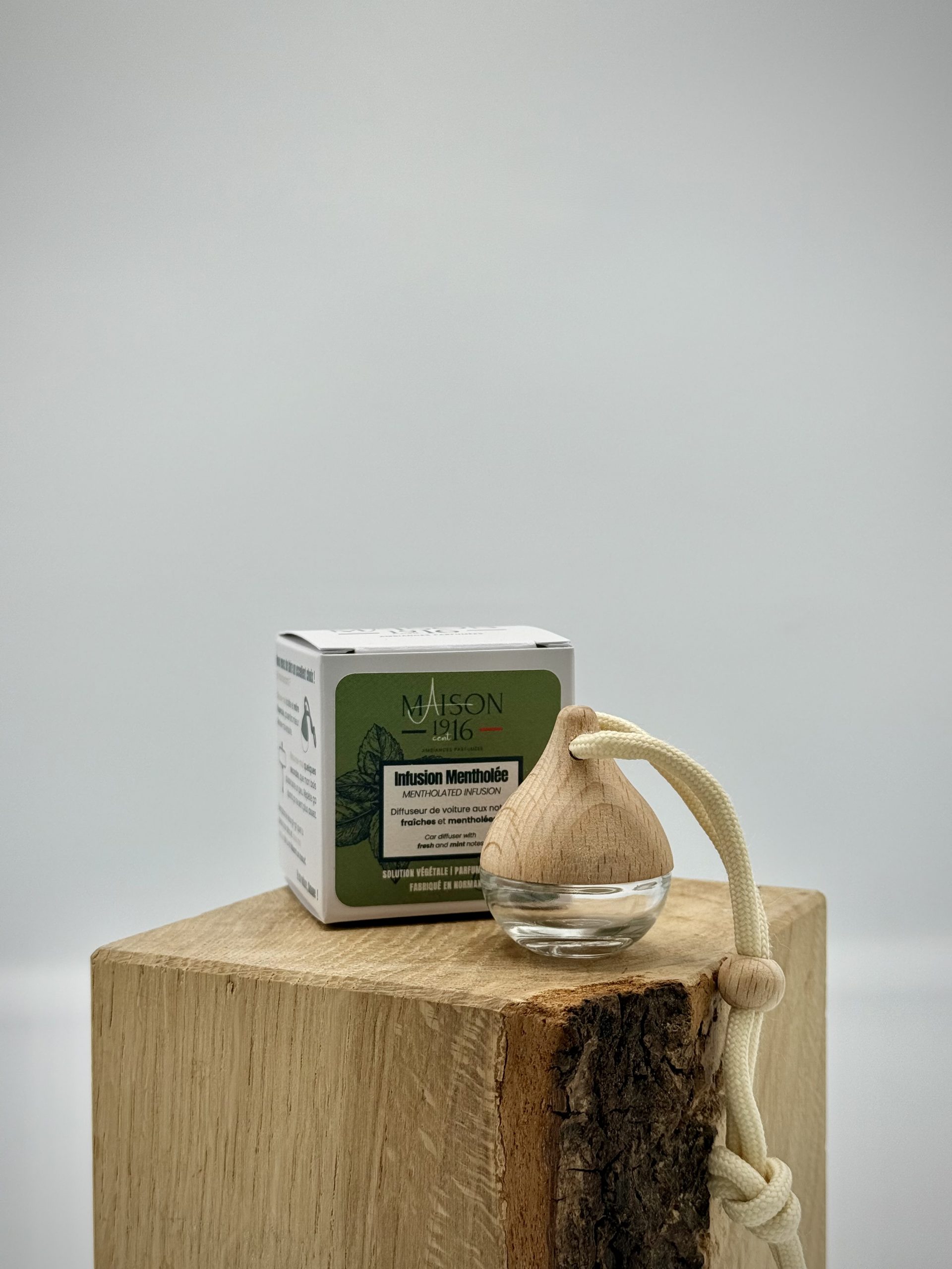 Diffuseur de voiture en verre avec son bouchon en bois brut, conçu pour absorber et diffuser le parfum en continu. Formulé avec une base végétale sans alcool et un parfum de Grasse. Un format élégant et naturel, idéal pour parfumer l’habitacle efficacement et en douceur.